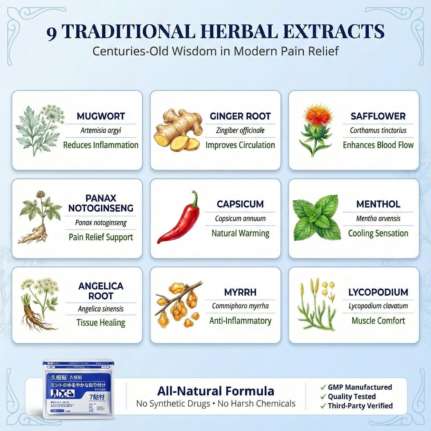 Our Japanese Joint Pain Patch is crafted using a time-honored blend of 9 natural herbal extracts, manufactured in facilities that adhere to strict quality and safety standards. Every batch undergoes rigorous testing to ensure purity, potency, and consistency.